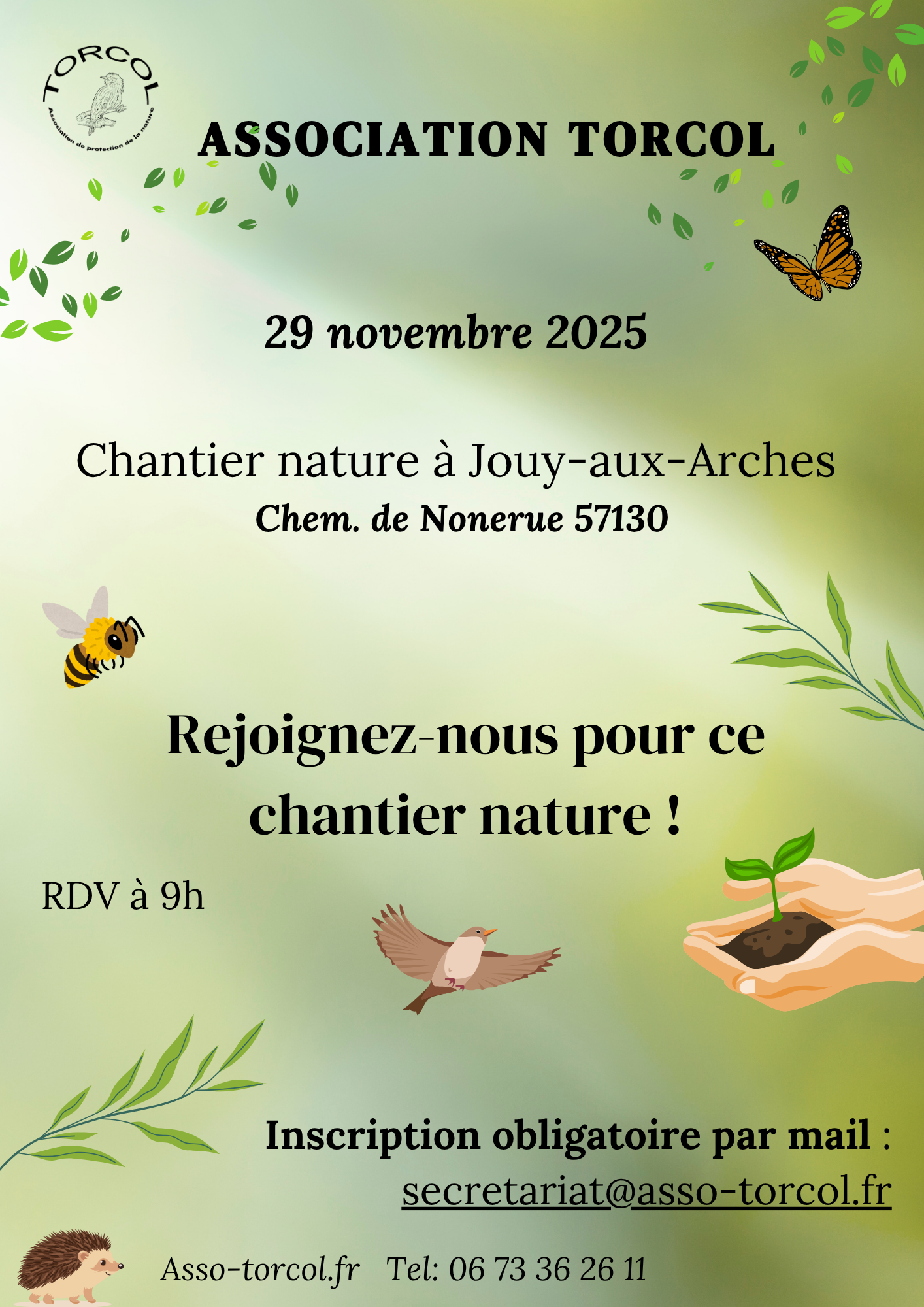 Torcol a besoin de vous et organise un chantier nature le Samedi 29 novembre 2025 de 09h00 à 12h00 sur les coteaux de Jouy-aux-Arches, Chemin de Nonerue (49.059154, 6.084225). Nous vous conseillons de vous garer dans les rues du village non loin de là et de rejoindre le terrain à pied, rendez-vous au point rouge sur la carte ci-dessous.