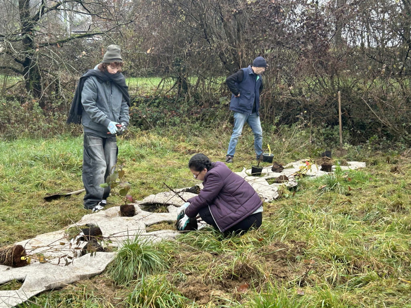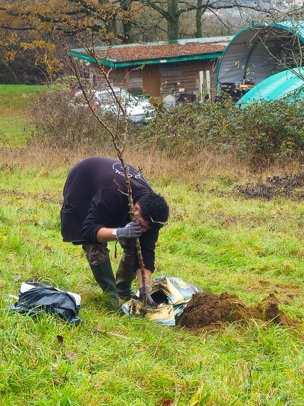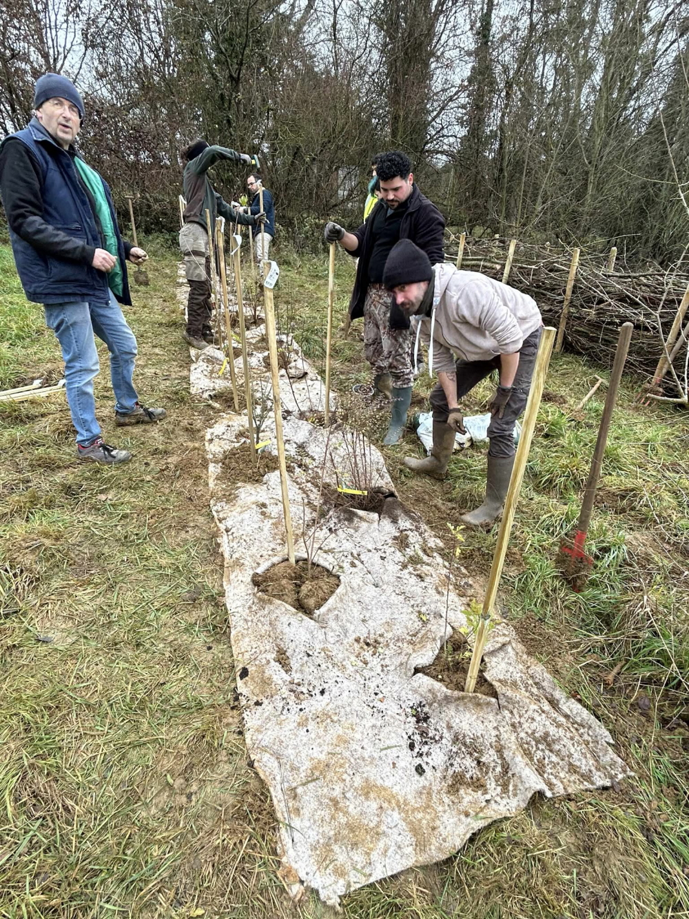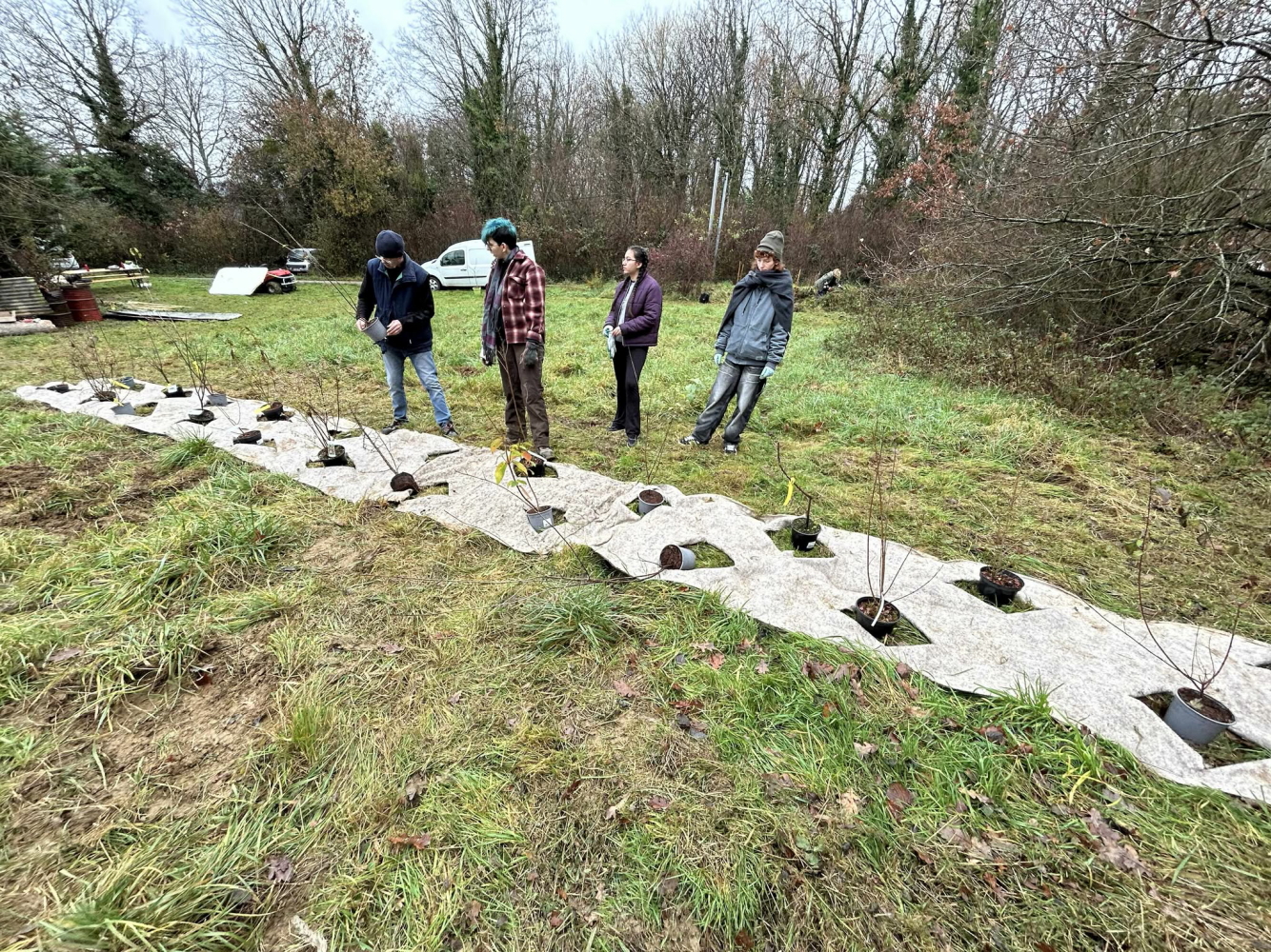Plusieurs arbres fruitiers ont été plantés, ainsi qu’une haie d’arbustes d’essences différentes et la création d’une haie sèche afin d’utiliser les branchages morts pour créer une clôture écologique et favoriser la biodiversité.